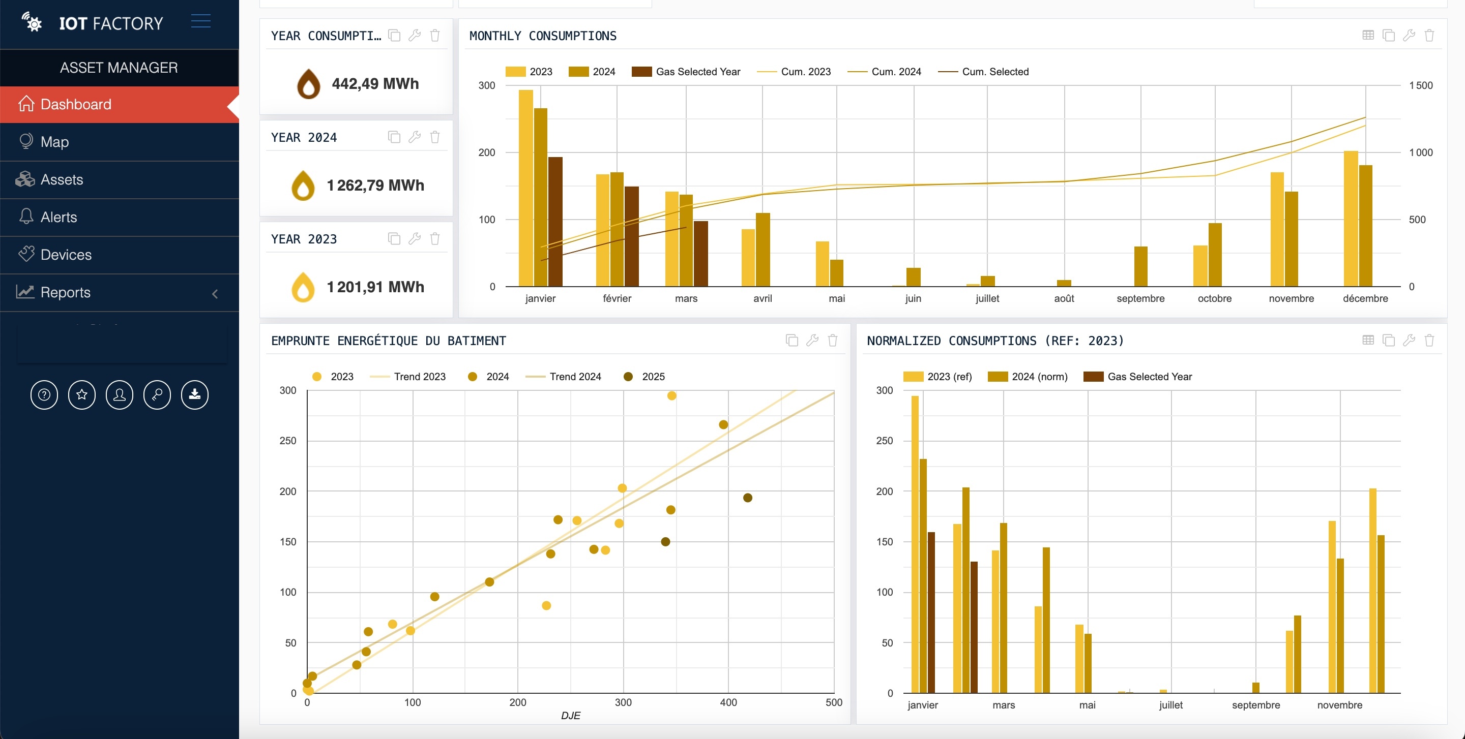 Normalize all heating consumption (gas, oil, etc.) directly linked to the outside temperature, excluding consumption for domestic hot water. Electricity consumption should not be standardized.
