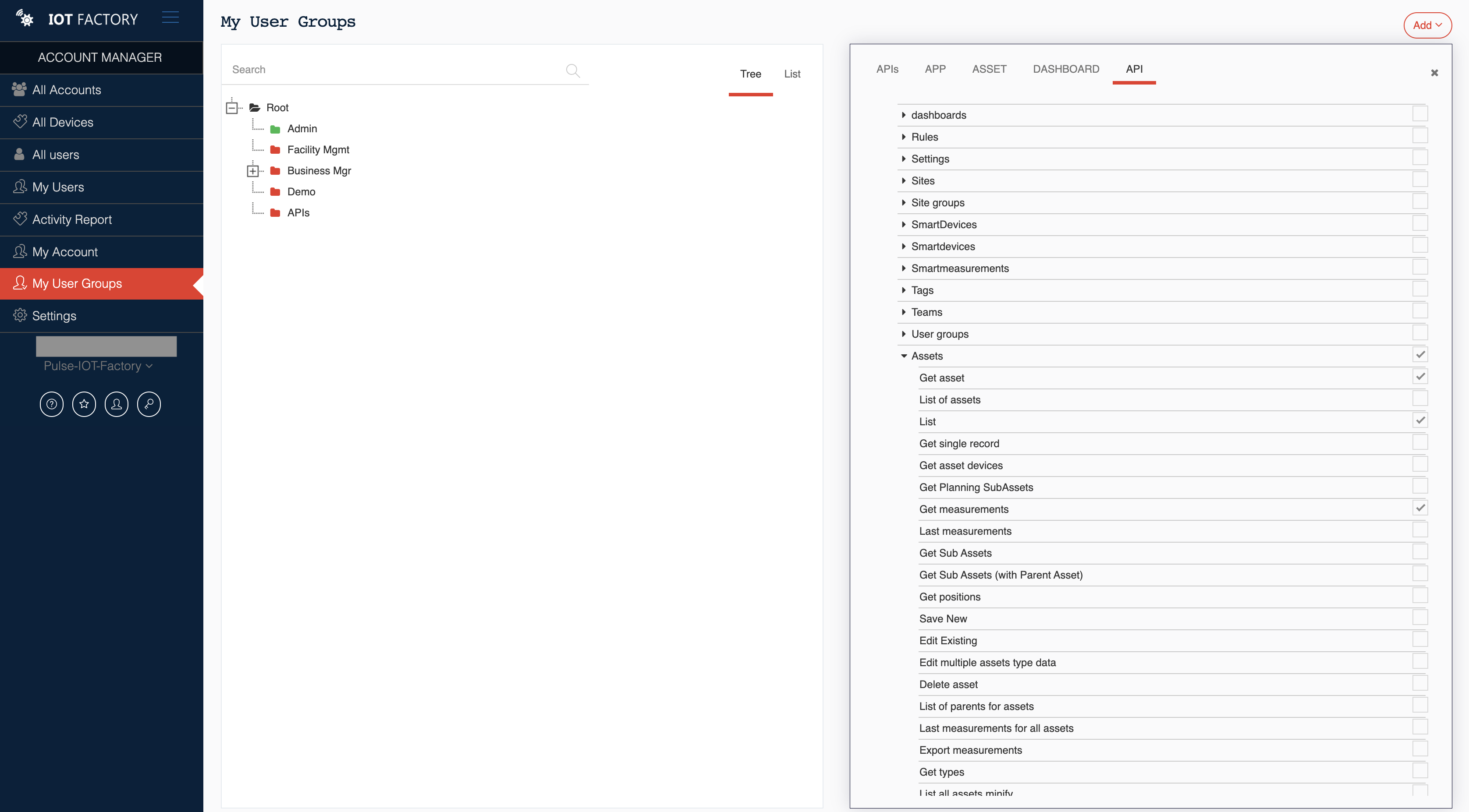 APIs access rights are defined by creating a user group and defining the access right per API. In the account manager, user groups, create a group and define all apis access rights.